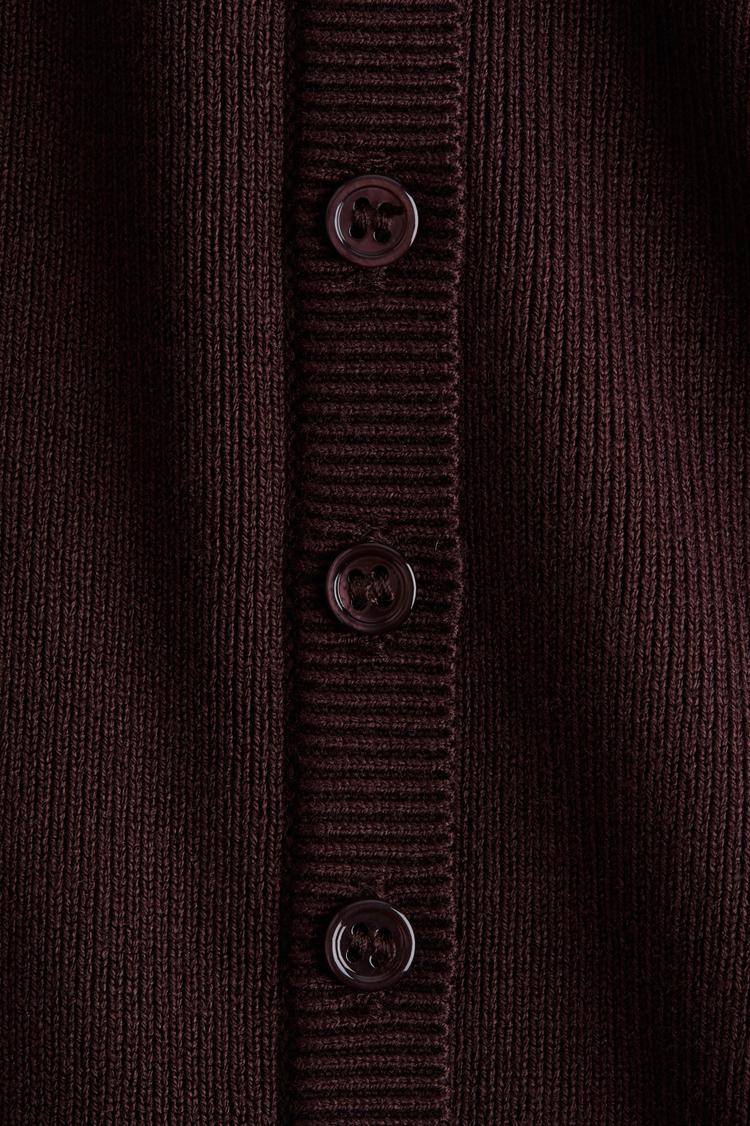 Deeply elegant and minimal, this fitted knit shell top features a striking square neckline and long sleeves for a polished silhouette. Crafted in a rich matte dark burgundy hue, the top is detailed with a classic button-down front that adds subtle texture and ease of wear. Perfectly hip length, it pairs effortlessly with tailored pants or skirts, making it a versatile choice for casual days, workwear, or business casual settings throughout autumn and winter seasons.