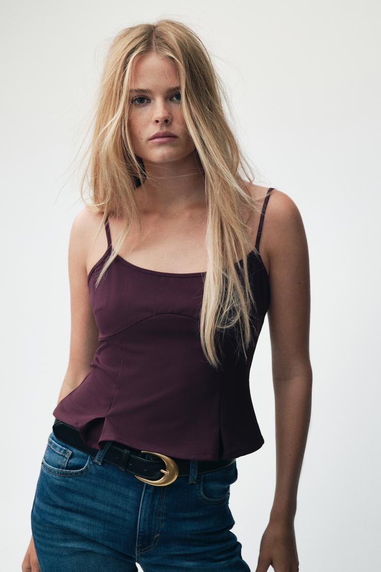 Soft matte dark purple fabric and a fitted silhouette define this minimalist camisole. Featuring delicate spaghetti straps and a square neckline, it offers a sleek, waist-length cut ideal for warm spring and summer days. This strappy top pairs effortlessly with jeans or skirts, making it versatile for casual outings, brunch dates, or relaxed evenings. The pullover style ensures easy wear, while the clean solid color enhances its casual chic appeal.