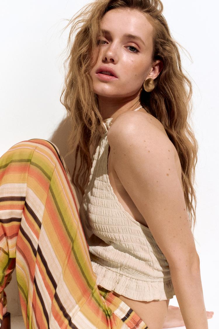 Soft cotton fabric with a delicate textured finish creates this cropped halterneck top, featuring a smocked bodice and ruffled hem for subtle feminine charm. Its sleeveless design and halter neckline make it perfect for warm spring and summer days. The regular fit offers comfort while maintaining a flattering silhouette. Ideal for casual outings, brunches, or vacation wear, this minimalist piece blends modern style with easy everyday elegance.