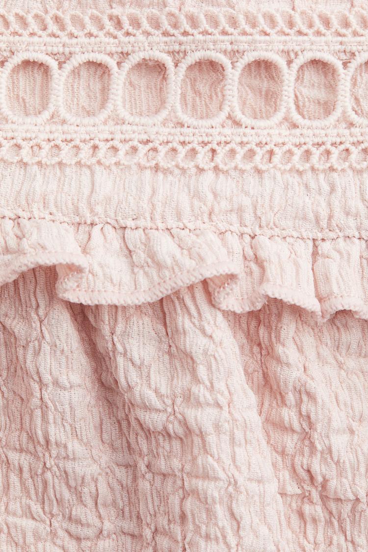 Soft matte dusty pink jersey fabric with delicate eyelet embroidery and flutter sleeves creates a romantic, casual chic vibe in this shell top. Featuring a relaxed fit and tie-up closure at the round neckline, the hip-length silhouette is perfect for spring and summer days. Subtle ruffle details along the sleeves and front add a feminine touch, making it ideal for everyday wear, brunch dates, or casual outings. Lightweight and textured, this versatile top pairs effortlessly with jeans or skirts for a fresh, stylish look.