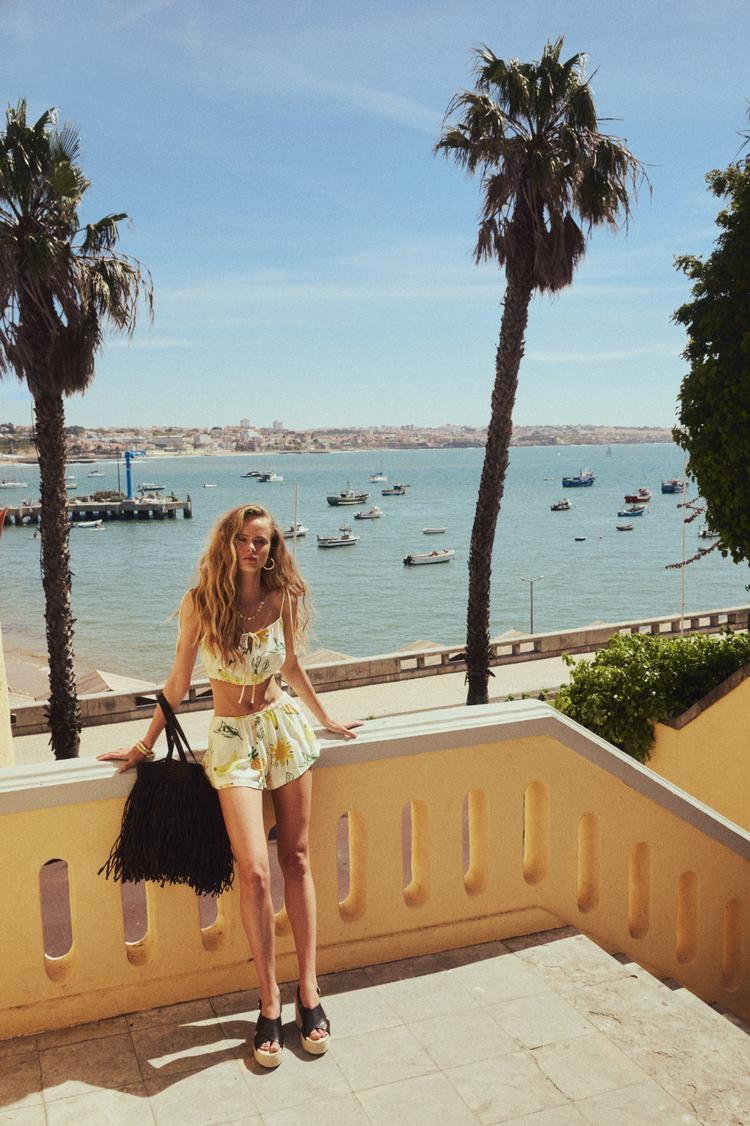 Bright and breezy, this tie-detail cropped top in soft white cotton features a fresh floral print in sunny yellow and green tones. Its slim fit, straight neckline, and delicate spaghetti straps create a light, airy silhouette perfect for warm spring and summer days. The tie-up closure adds a playful touch, making it ideal for casual outings, beach days, or vacation wear. Embrace effortless style with this versatile piece that pairs beautifully with high-waisted shorts or skirts for a relaxed yet chic look.