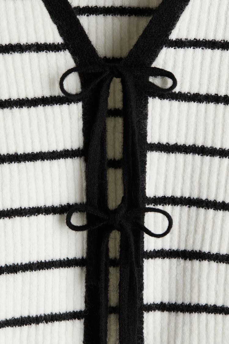 Soft rib-knit fabric and a slim fit define this cropped top, featuring a flattering V-neck with an open front secured by two delicate tie-up bows. Its half sleeves and black-and-white striped pattern lend a casual chic vibe, perfect for spring to autumn wear. The covered back and ribbed texture add subtle detail, making it versatile for everyday, brunch, or casual outings. Pair with high-waisted jeans for a stylish, minimalist look that balances comfort and trendiness.