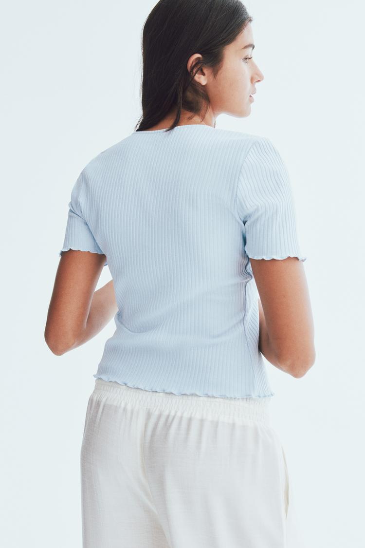 Soft ribbed cotton fabric and a fitted silhouette create a flattering cropped top in a delicate light blue shade. Featuring a V-neckline and half sleeves, this tie-front top is accented with lace trim details along the front opening and subtle lettuce hems on the sleeves and bottom. Perfectly suited for casual days, brunch dates, or everyday wear during spring and summer, its adjustable tie closure adds a charming, customizable fit. This minimalist piece blends comfort and feminine design effortlessly for a versatile addition to your warm-weather wardrobe.