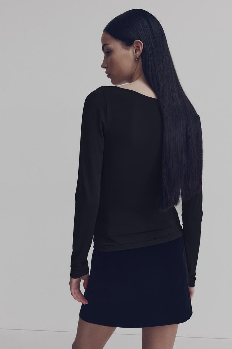 Subtle draping and a twist detail define this fitted blouson top in matte black, featuring a sophisticated square neckline and long sleeves for a sleek silhouette. Its hip-length cut and minimalist style make it a versatile choice for casual days, workwear, and business casual settings. Crafted with a soft fabric that complements the modern chic aesthetic, this pullover top pairs effortlessly with skirts or trousers, bringing quiet elegance and refined comfort to your seasonal wardrobe.