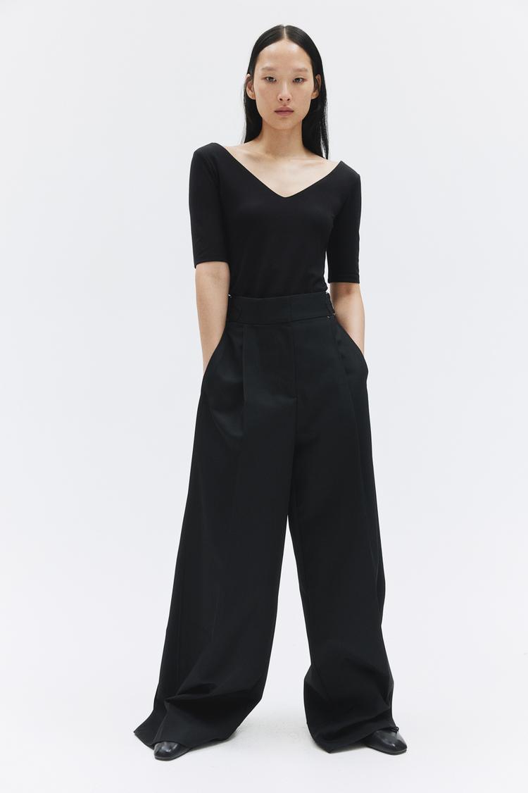 Fitted, short-sleeved top in thick jersey. V-neck at front and back with concealed silicone trim. Lined at top.