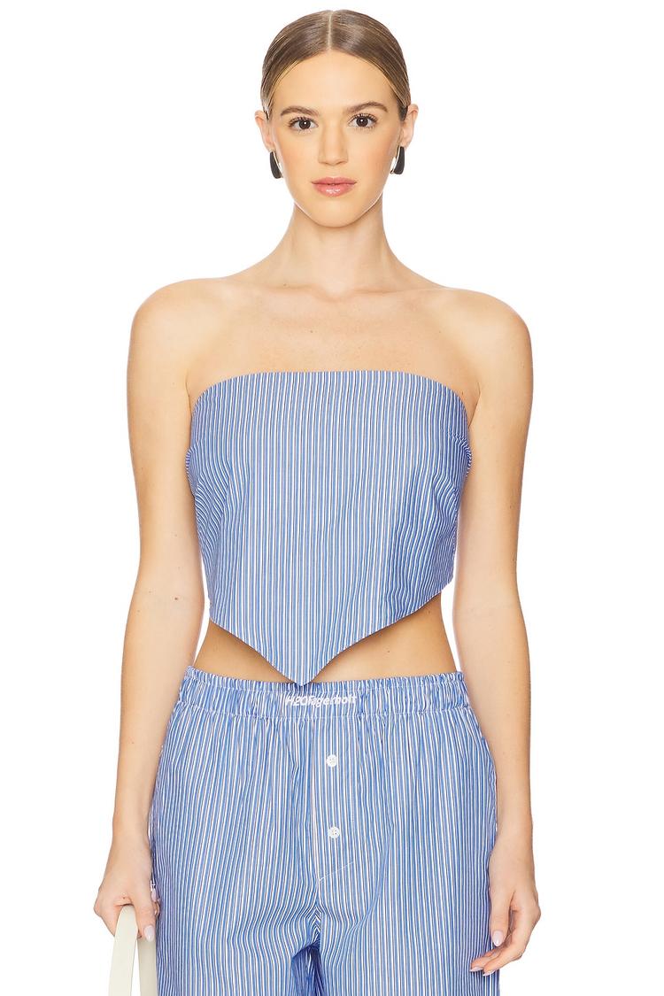 Lightweight cotton poplin and a strapless silhouette define this modern wrap top. Featuring a straight neckline and cropped length, it offers a loose fit perfect for warm weather. The blue and white all-over striped pattern adds a classic touch while the back tie closure enhances adjustability and style. Ideal for casual days, beach outings, or vacation wear, this versatile top pairs effortlessly with high-waisted bottoms for brunch or relaxed weekends.