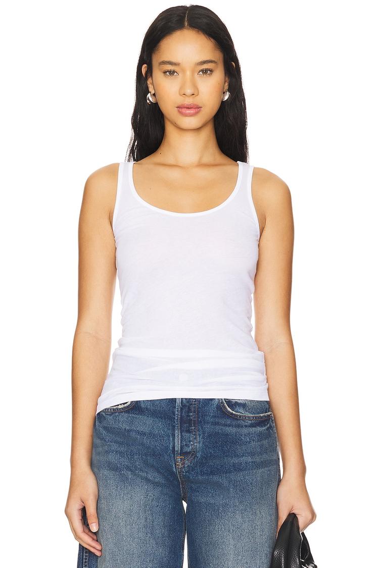 Soft, lightweight cotton jersey shapes this slim-fit tank top featuring a classic scoop neckline and wide straps for a comfortable sleeveless style. Falling to hip length with a covered back, it offers versatile minimalism ideal for casual wear, everyday errands, travel, or relaxed loungewear. The crisp white hue and clean silhouette make it a foundational piece that pairs effortlessly with denim or layered under jackets for a chic, casual look across spring and summer seasons.