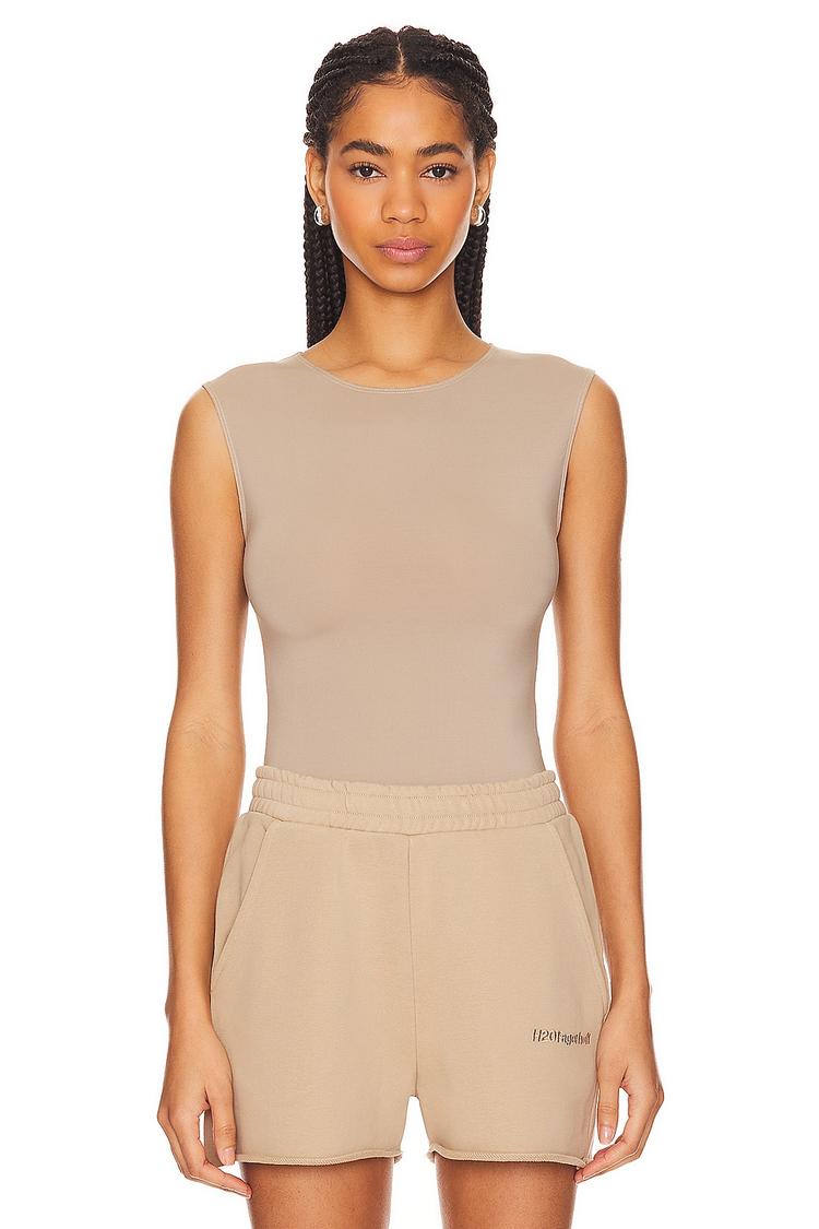 Effortless and sleek, this close-fitting bodysuit features a classic round neckline and sleeveless design that highlights a minimalist aesthetic. Crafted from a lightweight polyester-elastane jersey blend, it offers comfortable stretch and a smooth matte beige finish. The cropped length with a thong back and gusset snap button closure ensures a flattering silhouette and seamless wear. Subtle tonal embroidery on the front adds refined detail. Ideal for casual days, everyday wear, or relaxed loungewear, this versatile piece pairs perfectly with shorts or skirts for a chic, understated look.