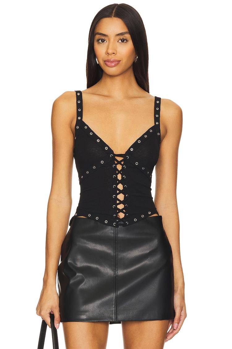 This sleek black corset top features a fitted silhouette and a striking cross-tie front detail with metallic silver grommets that add an edgy touch. Crafted from lightweight polyester-elastane knit fabric, it offers comfort and slight stretch for a flattering fit. The V-neckline and sleeveless design with sturdy straps create a modern, sexy vibe. Perfect for casual outings, date nights, or a night out, this waist-length top pairs effortlessly with skirts or pants to elevate your style with a bold, contemporary edge.