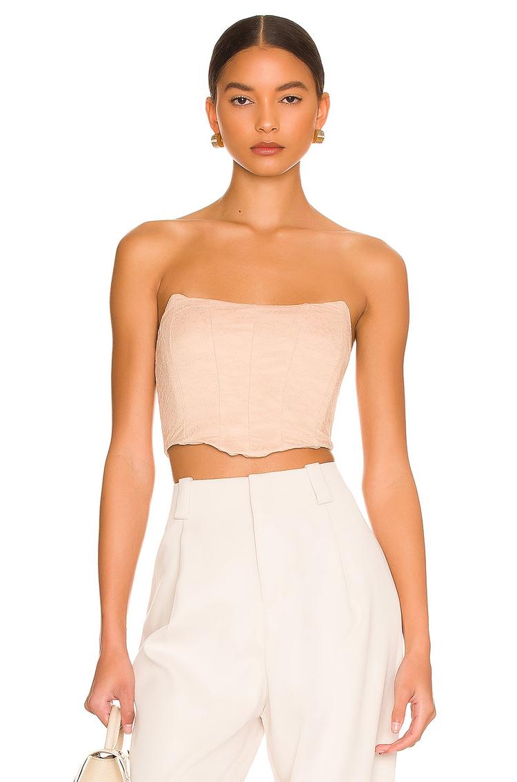 Feel effortlessly elegant in this Yasir Top by H:Ours. A strapless, cropped bandeau in a soft peach hue features a sheer lace overlay and a boned bodice for a sculpted silhouette. Self: nylon with elastane adds subtle stretch, while the poly-elastane lining keeps it comfortable against the skin. A discreet back hook-and-eye closure ensures a clean finish. Wear it high on the waist with tailored trousers or a sleek skirt for date nights, brunches, or summer events. Dress it up with delicate jewelry or keep it minimalist—the refined allure stays king.