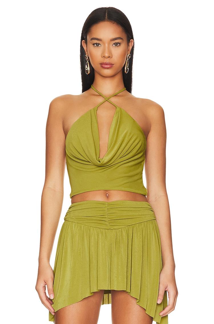 Embrace sun-soaked confidence with the Yimena Crop Top in lime. This halter-neck silhouette features a plunging cowl neckline and a graceful draped twist at the bust, all in a sleek, slinky jersey knit. Made from a polyester-spandex blend, it’s soft, stretchable and light on the skin with a subtle shine. The halter tie closure creates an open-back allure, while the cropped, fitted bodice pairs flawlessly with high-waisted bottoms. Perfect for a night out, vacation days, or brunch-ready weekends—wear solo or with the matching skirt as a bold two-piece statement. Effortless, chic, and endlessly versatile.