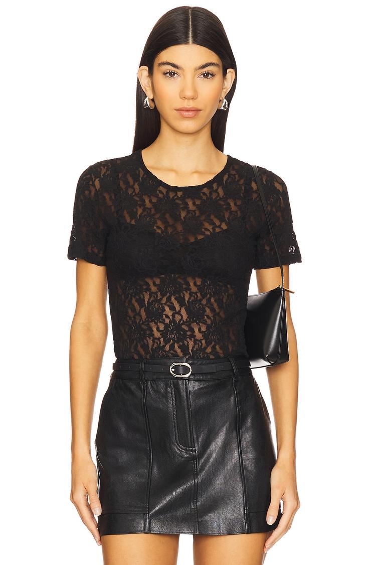 Delicate floral lace in lightweight nylon mesh shapes this fitted shell with a classic round neck and half sleeves, creating a chic silhouette with sheer allure. The hip-length cut offers a sleek profile perfect for layering or wearing alone. Ideal for spring and summer evenings, this top transitions effortlessly from casual outings to date nights and stylish nights out. Its modern sexy vibe pairs beautifully with leather or tailored pieces, making it a versatile staple for a confident, contemporary wardrobe.