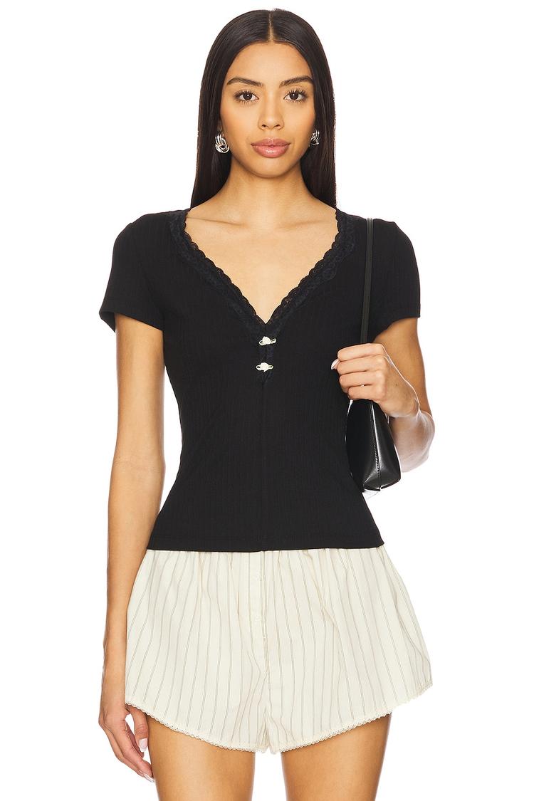 Lightweight knit fabric and a fitted silhouette combine for a flattering shell perfect for spring and summer outings. Featuring a classic V-neck trimmed with delicate ruffles and accented by small rosette buttons on the front, this waist-length top pairs elegance with casual ease. The half sleeves and covered back provide comfortable coverage, making it ideal for brunch dates, casual gatherings, or a relaxed night out. Crafted from a rayon blend with elastane and nylon contrast, it offers a soft, stretchy feel that moves with you.