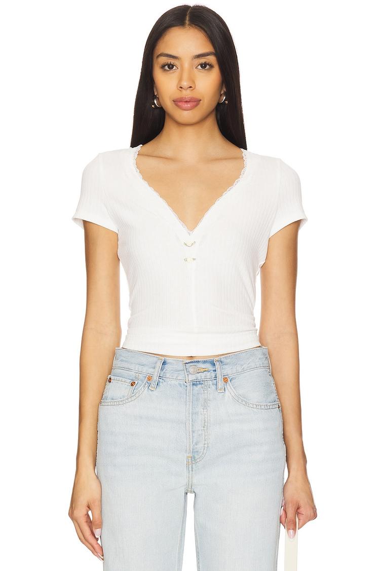 Soft ribbed jersey fabric and delicate lace-trimmed V-neckline define this fitted tank top with half sleeves. The waist length silhouette flatters with subtle rose detailing and ruffle accents around the neckline, adding a touch of feminine charm. Crafted from a blend of rayon, nylon, and elastane, it offers comfortable stretch and breathability, ideal for warm spring and summer days. Versatile for casual outings, everyday wear, or brunch dates, this minimalist top pairs effortlessly with denim or skirts for an understated chic look.