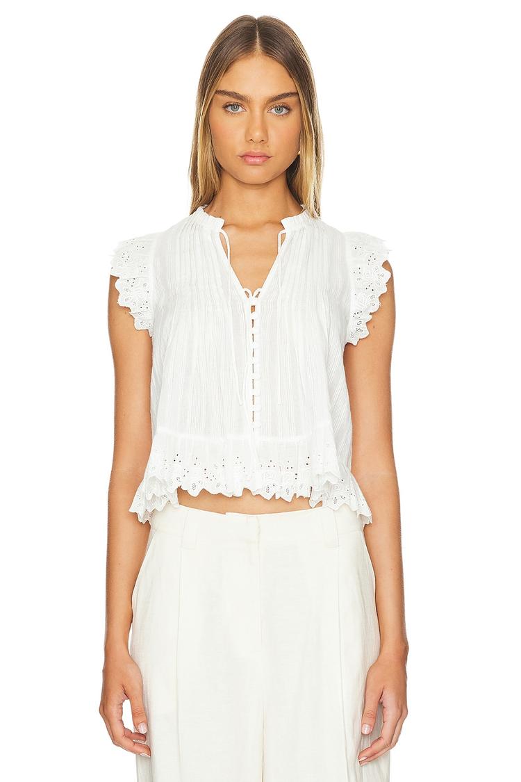 Lightly pleated cotton poplin with delicate eyelet embroidery and ruffled cap sleeves creates a romantic shell top. Featuring a relaxed fit, V-neckline, and partial front button closure with a tie, this waist-length top offers airy comfort perfect for spring and summer days. Ideal for casual outings, brunch dates, or everyday wear, its classic white hue and feminine details bring effortless elegance to your warm-weather wardrobe.