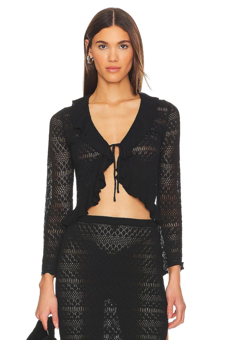 Delicate crochet knit fabric and ruffle details along the V-neckline and hem create a slim-fit, cropped silhouette perfect for warmer seasons. The front tie closure adds a playful touch while enhancing the bohemian and trendy vibe of this black top. Its long sleeves and fitted cut make it an ideal piece for casual outings, brunches, or night outs, blending comfort and style effortlessly.