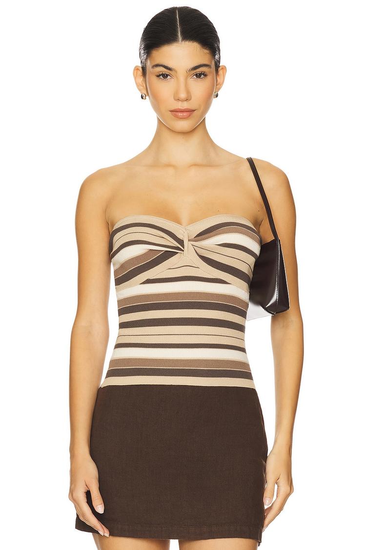Sleek and form-fitting, this bandeau top features a straight neckline and a strapless design perfect for warm spring and summer days. Crafted from a midweight slinky knit blend of viscose, polyester, and nylon, it offers comfortable pull-on styling. The all-over horizontal stripe pattern in brown, beige, and stone tones adds a modern, chic vibe ideal for casual outings, brunches, or night outs. Its hip-length silhouette enhances versatility, making it a trendy choice for day-to-night wear with a minimalist yet striking aesthetic.