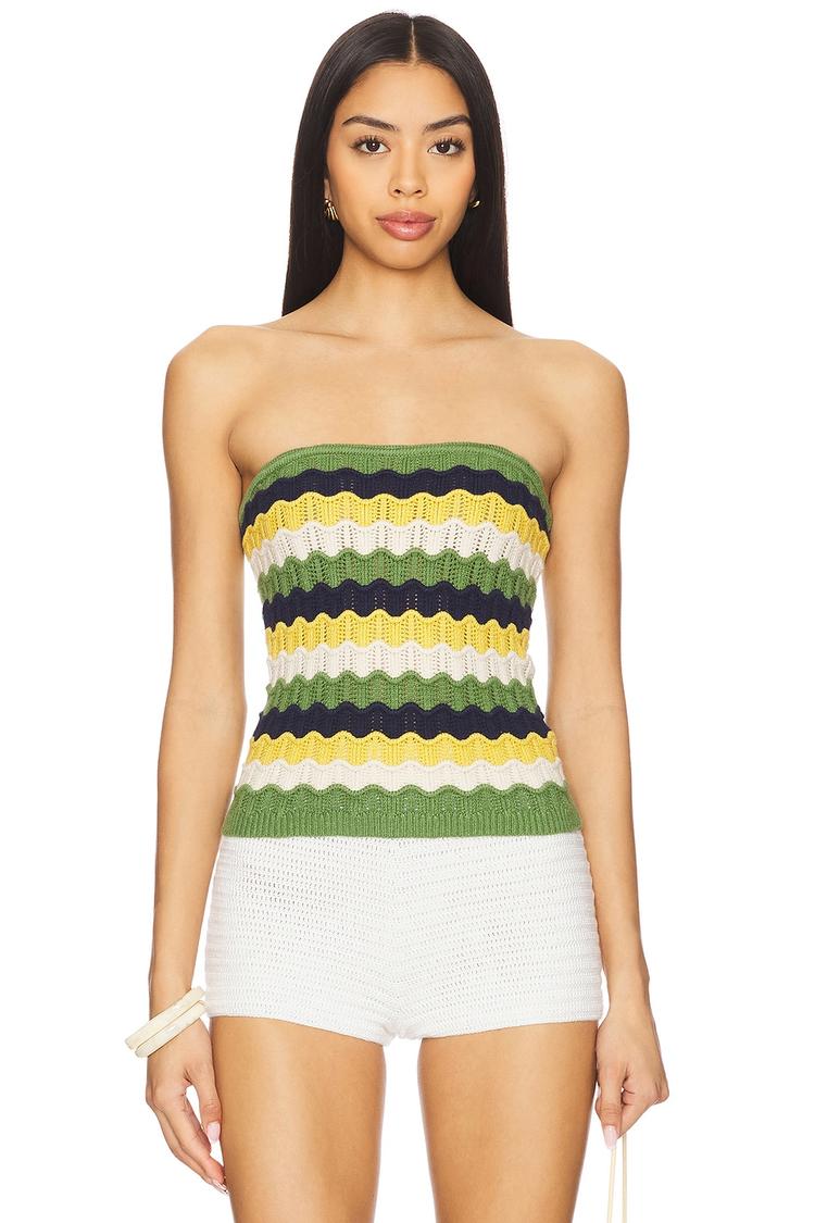 Midweight crochet fabric and a fitted silhouette bring a breezy, bohemian vibe to this bandeau top. Featuring a strapless neckline with a non-slip silicone lining, it ensures secure, comfortable wear throughout warm spring and summer days. The all-over wavy striped pattern in olive, yellow, black, and white adds trendy visual interest, while the semi-sheer texture lends an airy feel. Waist length and sleeveless, this versatile top suits casual outings, brunches, beach vacations, and streetwear looks with ease.