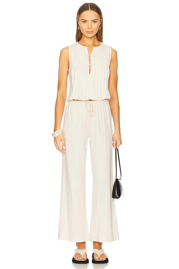 Soft matte ivory cotton-rayon blend brings effortless elegance in this sleeveless tank top featuring a round neckline and delicate tonal embroidery with ruffled detailing across the bodice. The loose fit and drawstring waistband enhance comfort and style, making it an ideal choice for casual brunches, relaxed vacations, or everyday wear during spring and summer. Front loop button closures add subtle charm, while the lightweight fabric ensures breathable ease for warm weather.