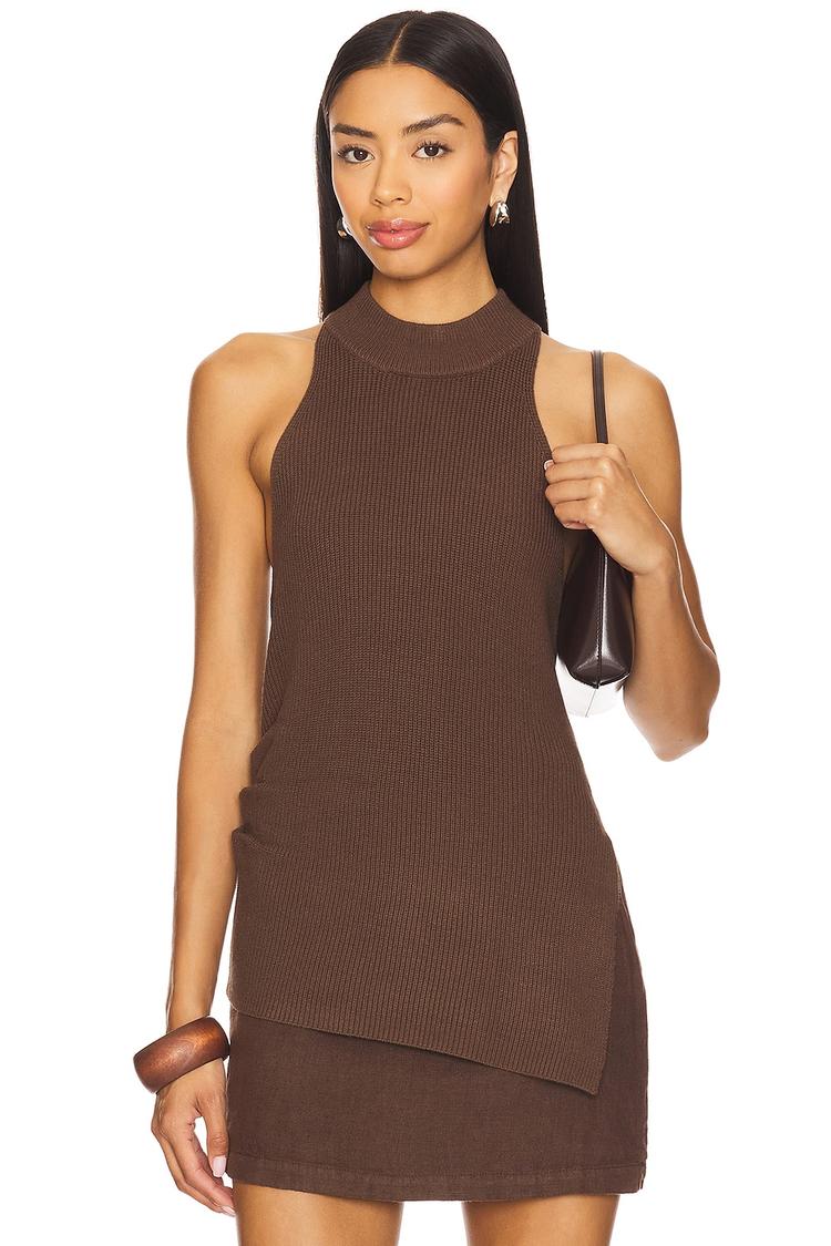 The Jones Top features a sleek mock neck and sleeveless design with wide straps, crafted from a midweight viscose-polyester knit for a smooth, matte finish. Its slim fit and asymmetric hem add modern minimalism to this hip-length tank, perfect for casual days, night outs, or brunch gatherings. The clean lines and subtle texture create an effortlessly chic silhouette that transitions seamlessly across seasons and occasions.
