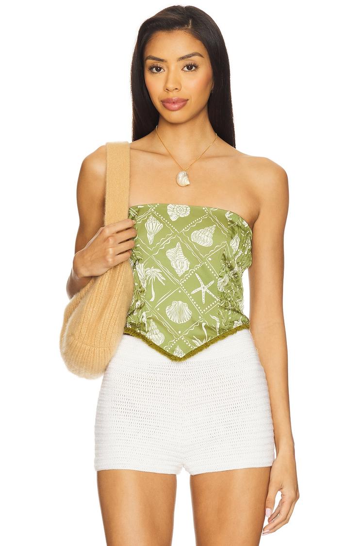 A midweight matte olive green satin bandeau top with a cropped silhouette and smocked elastic back offers a comfortable regular fit. Featuring an abstract off-white print all over, this strapless piece highlights front pintuck pleats and a playful fringe hem for a bohemian, casual chic vibe. Its pullover style and non-slip silicone neckline ensure ease and security, making it an ideal choice for spring and summer outings, beach days, brunches, or relaxed vacations. This versatile top blends trendy design with everyday comfort effortlessly.