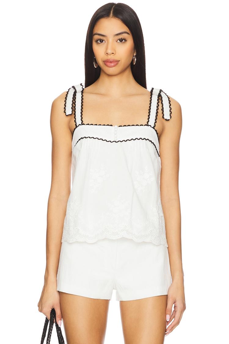 Lightweight cotton poplin with tonal floral embroidery and delicate eyelet detailing at the hem brings a fresh, classic charm to this sleeveless tank top. The square neckline and faux tie shoulder straps with contrast trim add a cute, casual chic vibe. Featuring partial front loop button closures and a cinched elastic back neckline for a comfortable regular fit, this hip-length top is perfect for warm spring and summer days. Ideal for casual outings, brunch with friends, or relaxed vacations, it pairs effortlessly with shorts or skirts for an easy, stylish look.
