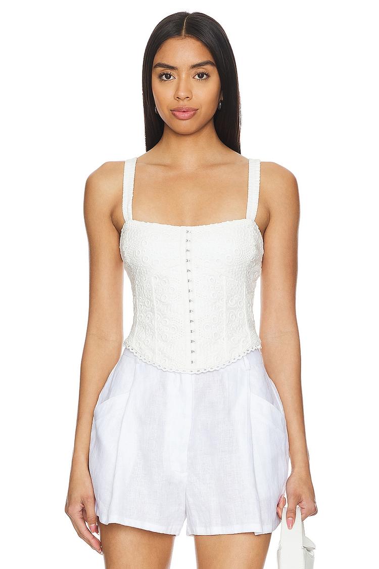 Delicate eyelet fabric and a smocked elastic back combine in this fitted corset top featuring a square neckline and wide straps for comfortable sleeveless wear. The front hook closure adds a classic touch, while adjustable straps ensure a perfect fit. Crafted from breathable cotton with a hint of polyester and spandex, this waist-length piece is ideal for spring and summer outings. Whether you're dressing for a casual day, brunch with friends, or a date night, its elegant and chic style makes it effortlessly versatile.