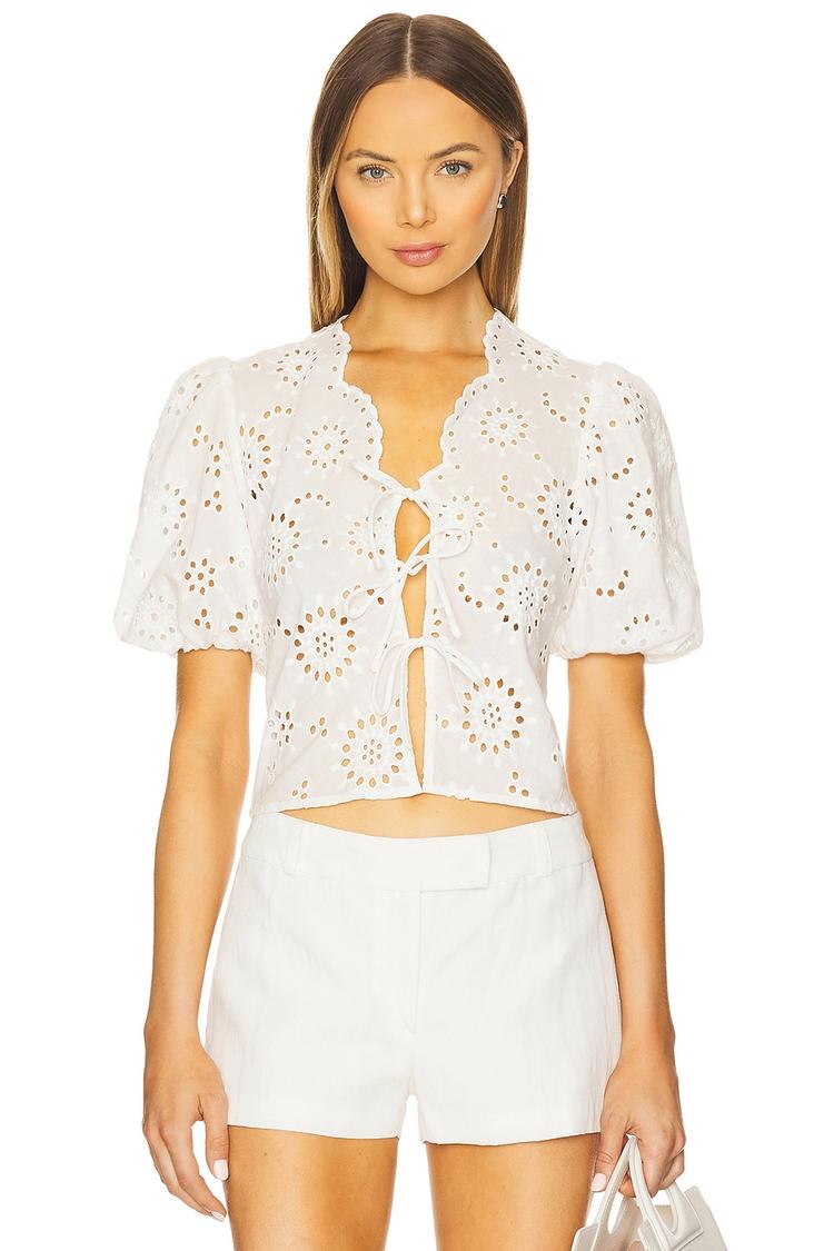 Delicately crafted from 100% cotton eyelet fabric, this cropped Roxana Top features a regular fit and charming puffed half sleeves. The notch lapel neckline with front self-tie closures enhances its bohemian appeal, while the all-over eyelet embroidery adds intricate texture. Perfect for spring and summer days, this versatile piece suits casual outings, brunch dates, and vacation wardrobes. Its midweight, breathable cotton fabric ensures comfort and style in equal measure.