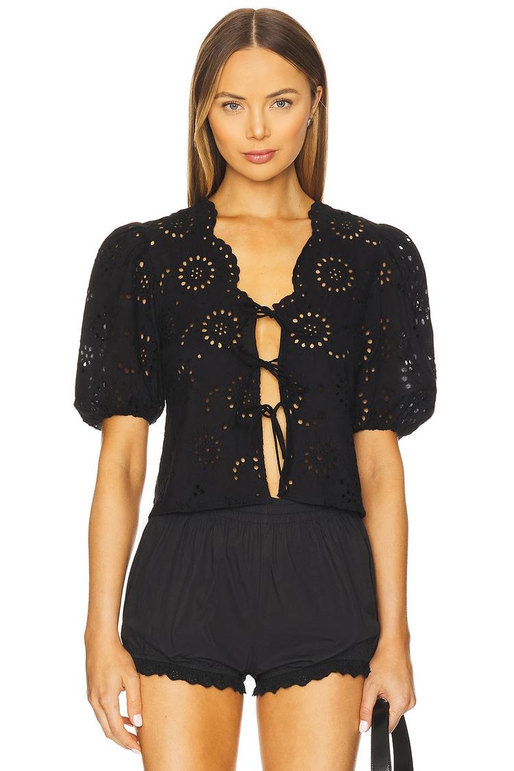 Midweight cotton eyelet fabric and a cropped silhouette define this Roxana Top with a relaxed fit and charming puffed half sleeves. The deep V-neckline and front self-tie closures add subtle allure, while the all-over eyelet embroidery offers a bohemian touch. Perfect for spring and summer, this versatile piece transitions effortlessly from casual brunches to date nights and laid-back outings, embracing a casual chic vibe with breathable comfort and feminine detailing.