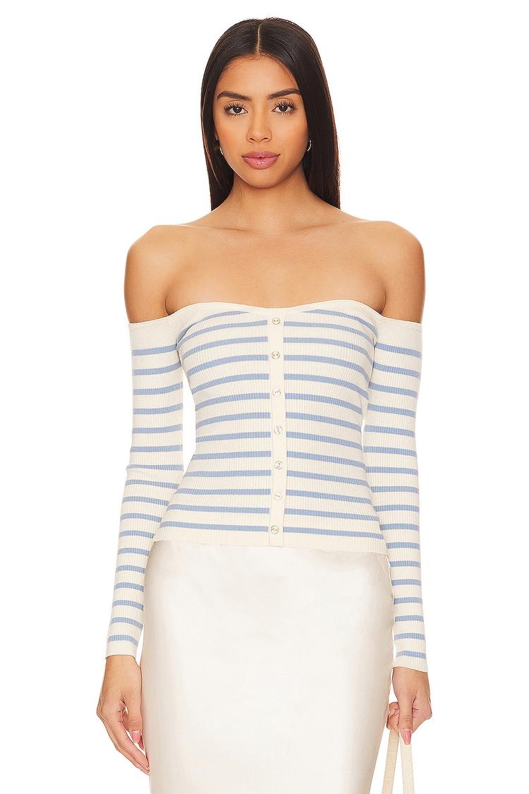 Soft ribbed jersey fabric and a fitted silhouette define this modern off-shoulder corset top, designed with long sleeves and a front button closure. The classic white base with gray horizontal stripes adds a chic and sexy touch, perfect for spring through autumn. Its waist-length cut flatters the figure, making it an ideal choice for casual outings, brunches, or stylish date nights. The ribbed texture enhances comfort and style, offering a versatile piece that pairs well with various bottoms for effortless, contemporary looks.