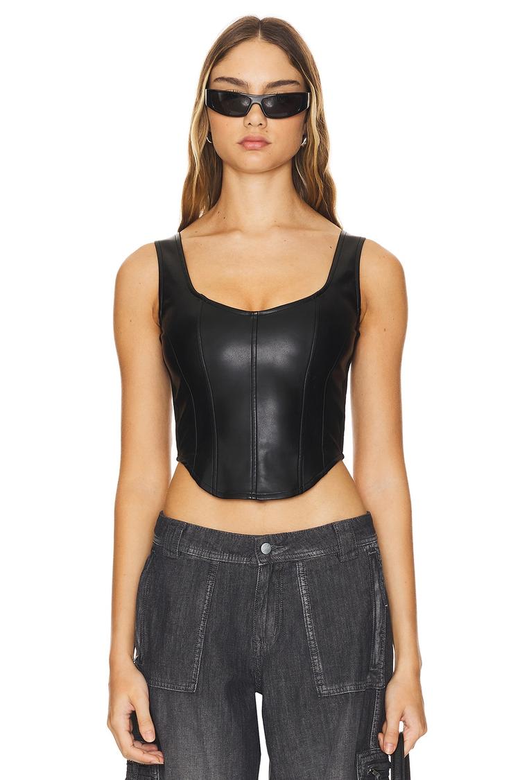 Sleek and modern, this fitted cropped corset tank top features a matte black faux leather front with a distinctive kerchief hem. The back is crafted from ribbed jersey fabric, offering a comfortable stretch fit. With wide straps and a flattering U-neckline, this sleeveless piece is perfect for casual outings, streetwear looks, or a night out. Its edgy yet chic vibe pairs well with high-waisted pants or skirts, making it a versatile addition for all weather seasons.