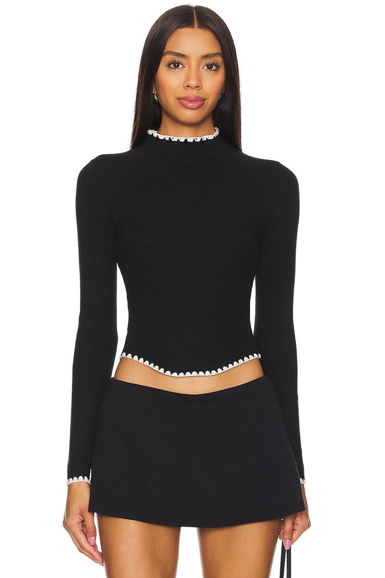 Ribbed jersey fabric and a sleek fitted silhouette define this cropped mock neck top, enhanced by delicate white ruffle trim at the collar, cuffs, and hem. Its long regular sleeves and pullover style offer comfortable wear, making it a versatile choice for autumn and winter. This minimalist and chic piece pairs effortlessly with skirts or high-waisted pants, ideal for casual outings, brunch dates, or night out occasions. The subtle contrast of black with white trim adds a refined touch to this modern essential.