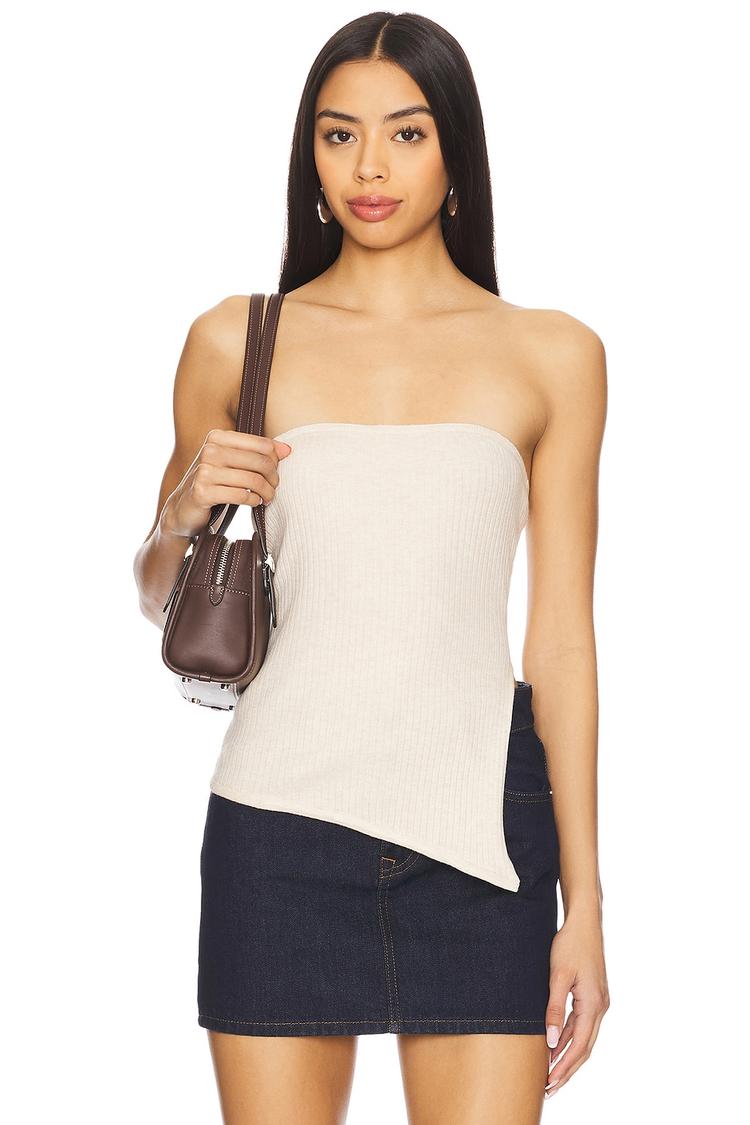 Soft ribbed knit fabric with a subtle midweight feel shapes this bandeau top featuring a sleek straight neckline and sleeveless, strapless styling. Its slim fit hugs the body while an asymmetrical hem with side slit adds a modern edge. The non-slip silicone neckline ensures comfortable wear, making it a stylish choice for casual days, brunch dates, or night outs. Crafted from a blend of nylon, polyester, acrylic, and wool, this beige top balances minimalist chic with functional design, perfect for spring through autumn wardrobes.