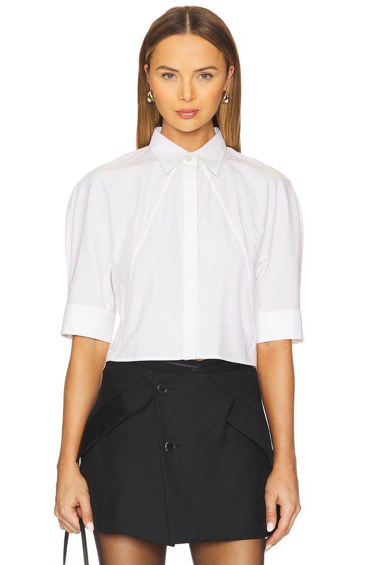 Crisp white cotton poplin defines this articulated shell top with a pointed collar and front button closure. Its regular fit and cuffed half sleeves offer a polished yet comfortable silhouette, making it a versatile choice for workwear, business casual settings, and everyday wear. The waist-length hemline ensures a neat tuck or untucked styling option, perfect for pairing with skirts or trousers. A minimalist classic essential crafted with quality fabric, suitable for spring through autumn seasons.
