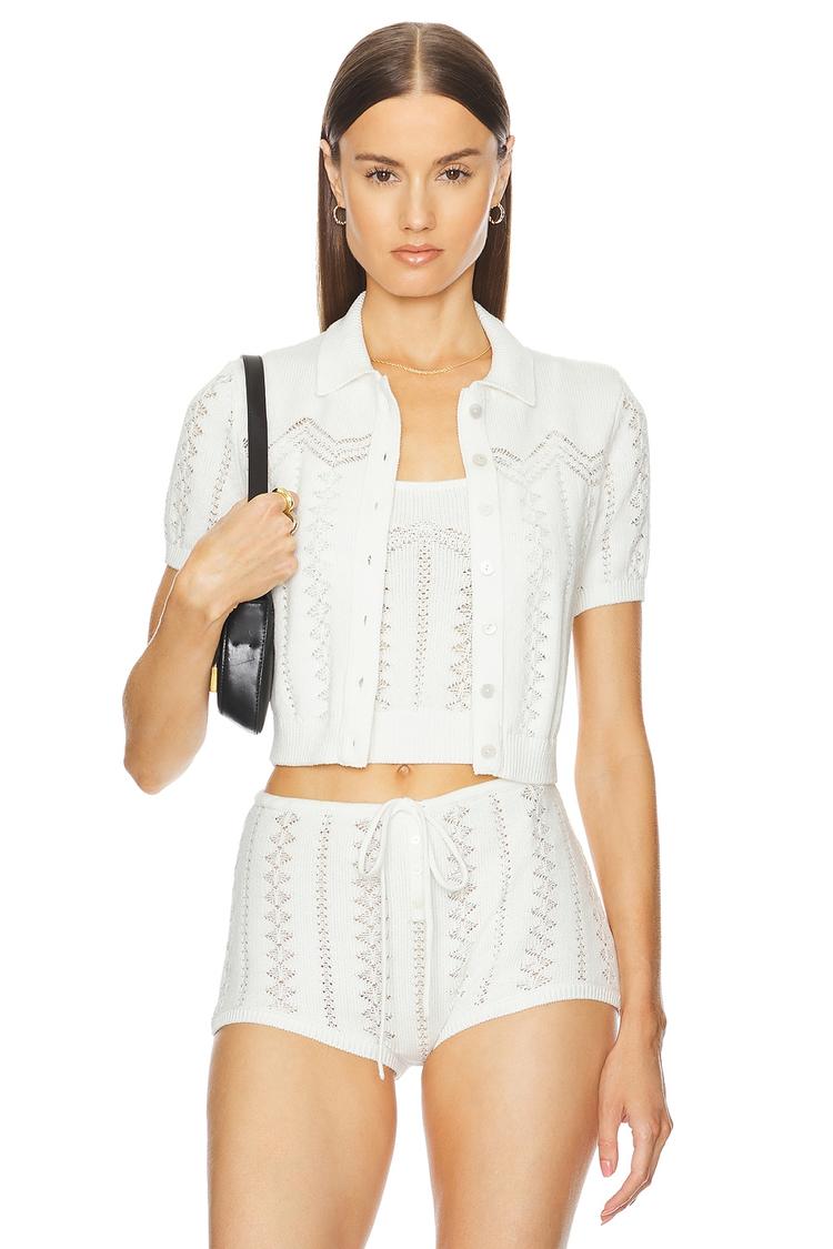 Lightweight knit fabric and delicate eyelet embroidery come together in this fitted cropped cardigan top, showcasing a band collar and half sleeves for a fresh, modern look. The front button closure adds classic charm while the airy cut-out design enhances breathability, making it ideal for warm spring and summer days. Perfect for casual outings, brunch dates, or vacation wear, this versatile piece pairs effortlessly with high-waisted shorts or skirts, offering a chic silhouette that balances comfort with style.
