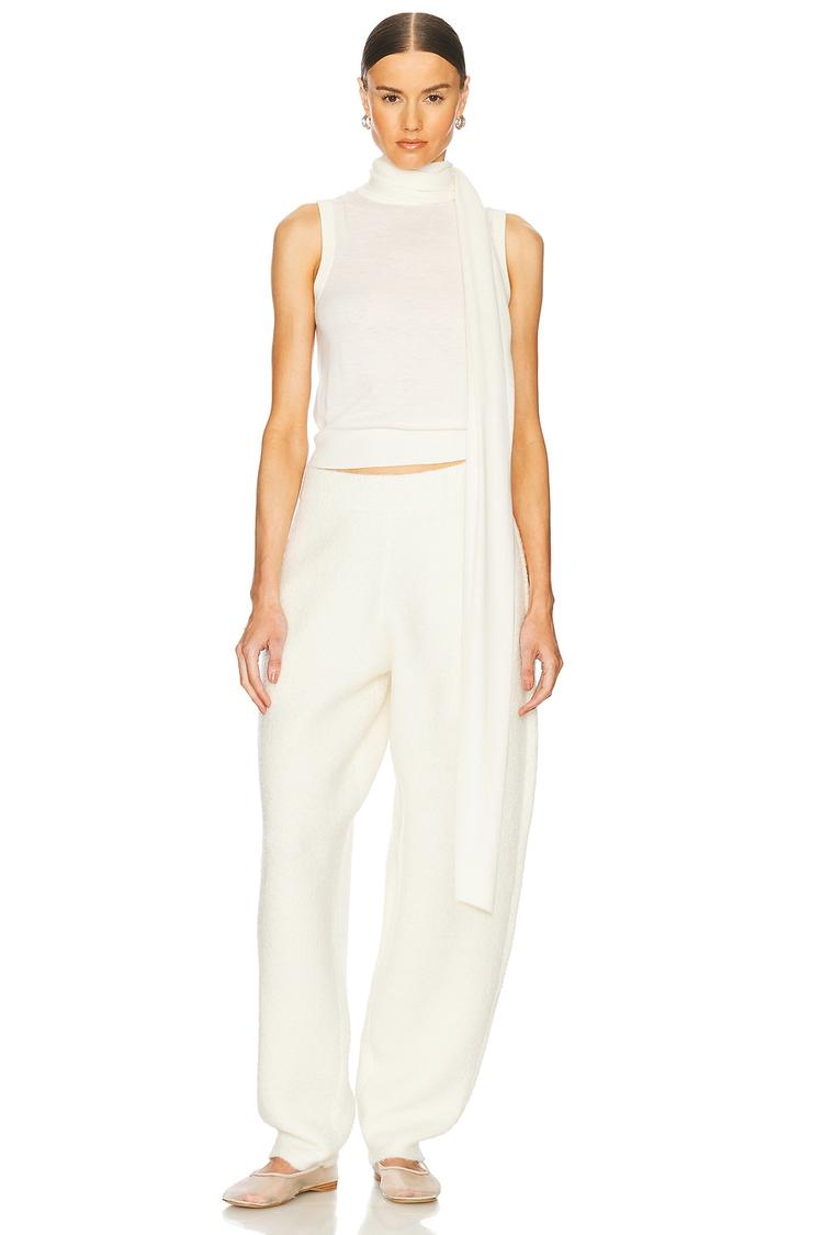 Lightweight knit fabric and an attached scarf detail elevate this cropped tank top in a chic off-white hue. Featuring a high neckline and sleeveless design, it offers a minimalist silhouette with regular fit perfect for spring through autumn. The pullover style ensures easy wear, making it ideal for casual outings, brunch dates, or relaxed evenings. Combining soft polyester and cashmere fibers, this top provides a refined texture and subtle warmth while maintaining breathability. Its versatile, modern design complements a variety of looks from laid-back to polished.