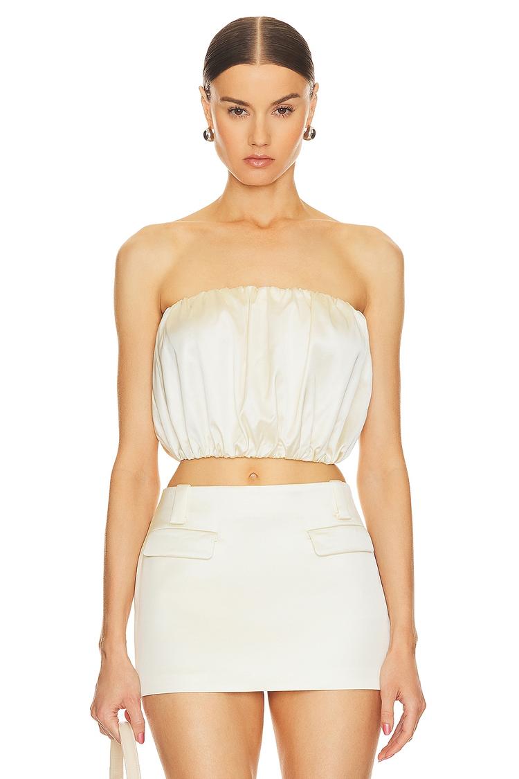 Satin sheen and a bubble hem define this chic Bandeau top, tailored in a relaxed fit that stops at the cropped length. The elasticized neckline and hem ensure easy pullover wear while creating subtle volume that adds modern flair. Its strapless neckline and sleeveless design make it an ideal choice for warm spring and summer days. Perfectly suited for casual outings, brunch dates, and night outs, this versatile piece combines comfort and style in a smooth satin fabric blend.