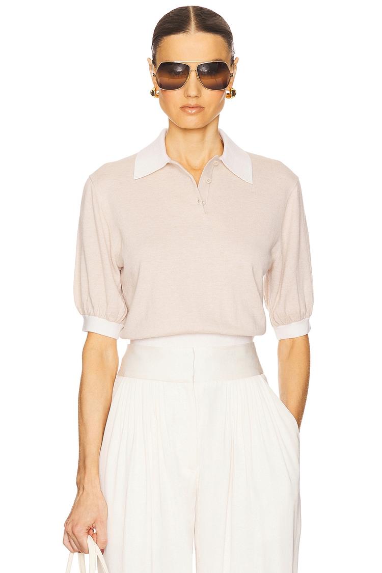 Soft matte beige knit fabric meets classic polo styling in this Liesel Polo with a crisp white collar and cuffed half sleeves. The regular fit and hip length silhouette offer effortless elegance and comfort, while the front partial button closure adds subtle detail. Crafted from a luxurious blend of polyester, cotton, and cashmere, this lightweight knit top transitions seamlessly from workwear to business casual and brunch occasions, making it a versatile wardrobe essential for spring through autumn.