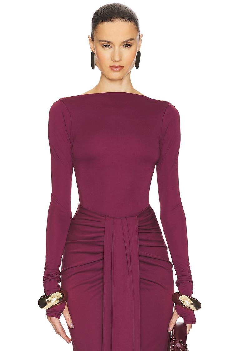 Matte jersey fabric shapes this fitted tank top, featuring a deep scoop neckline at the back that adds an elegant touch. The long regular sleeves include thumb-hole details for a modern, functional twist. Its waist-length silhouette and minimalist design make it a versatile choice for casual outings, workwear, or date nights. Crafted from a soft polyester-elastane blend, it offers both comfort and stretch with a sleek, sophisticated finish in a rich dusty plum hue.