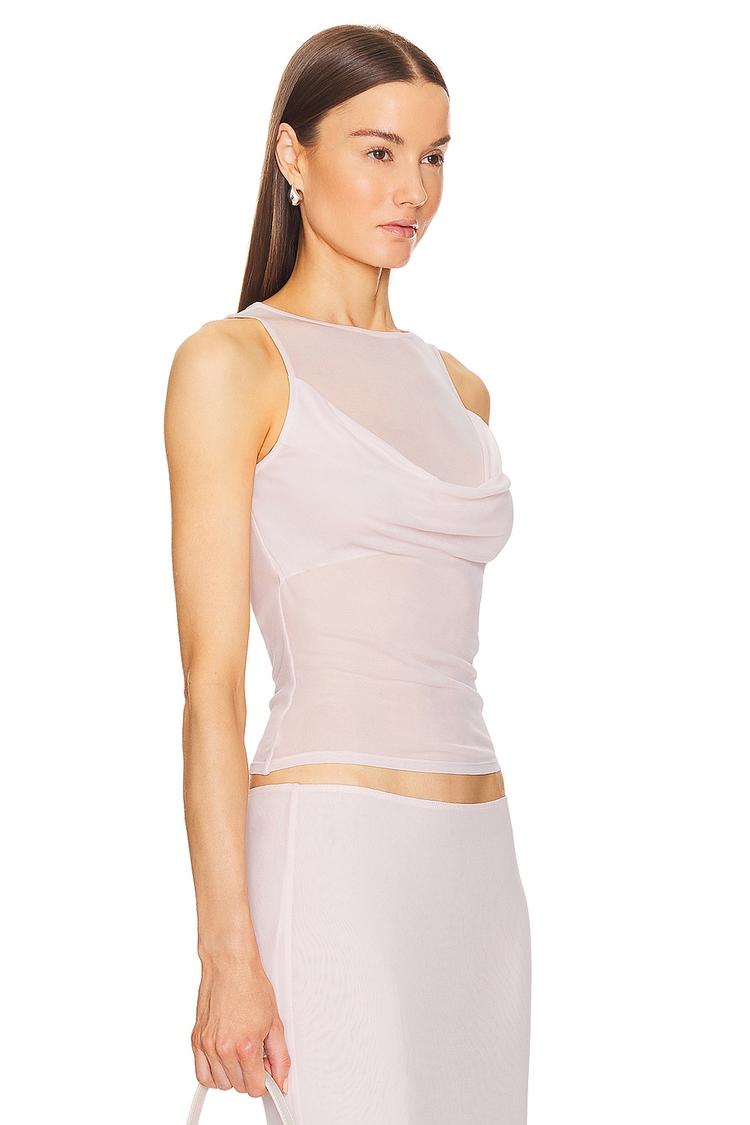 Soft drape and semi-sheer mesh fabric define this slim-fitting tank top in a delicate light pink hue. The sleeveless design with wide straps and a draped neckline creates a modern and minimalist silhouette, perfect for warmer spring and summer days. Waist-length and effortlessly chic, this top pairs beautifully with casual, brunch, or date night looks, offering a subtle sheer texture that adds intrigue and sophistication. Crafted from viscose mesh, it delivers breathable comfort with a contemporary edge.