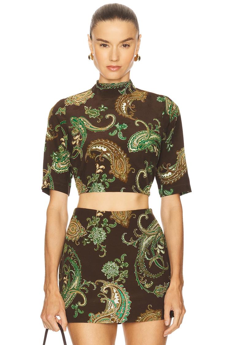 Lightweight viscose crepe fabric shapes this cropped boxy top with a chic mock neck and elbow-length sleeves. The all-over paisley print in earthy greens and beiges stands out against a rich matte brown base, creating a modern, stylish look. Button closure at the covered back adds subtle detail. Its relaxed boxy fit and cropped length make it an ideal choice for casual outings, brunches, or night outs during spring and summer. This versatile piece brings effortless sophistication to your wardrobe with its contemporary cut and vibrant paisley design.