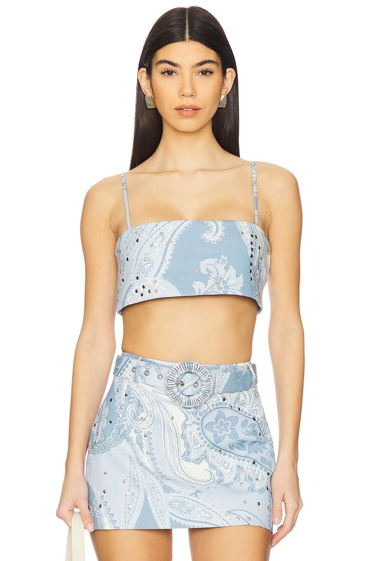 Matte light blue cotton bralette with a straight neckline and delicate spaghetti straps offers a fitted, cropped silhouette perfect for spring and summer. Featuring an all-over white paisley print complemented by silver metal detailing, this modern and trendy piece includes adjustable straps and a hidden side zipper closure for a comfortable, secure fit. Ideal for casual days, brunch outings, or night events, it pairs effortlessly with high-waisted bottoms to create a chic ensemble that highlights effortless style and versatility.