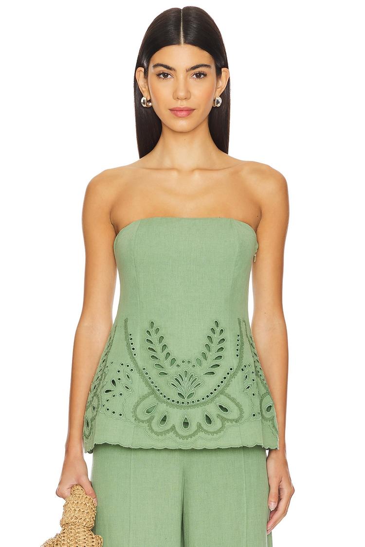 Soft linen-cotton blend and delicate eyelet embroidery define this strapless top's breezy appeal. Featuring a regular fit and hip length hem, it elegantly frames the neckline with a strapless design and sleeveless styling. The hidden side zipper closure ensures a smooth silhouette, while the all-over eyelet details add a sophisticated bohemian touch. Ideal for casual outings, brunch dates, and vacation days, this versatile top combines comfort with effortless style for warm-weather wardrobes.