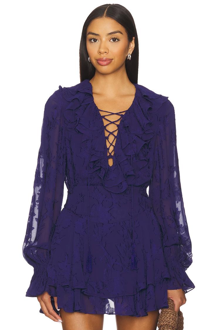 Soft matte dark purple viscose with romantic ruffled accents and delicate lace trim create an elegant blouson top featuring a flattering V-neck with front tie-up detail. The relaxed fit and long blouson sleeves enhance comfort, while the thigh-length hem adds a playful, flirty touch. This lined piece is perfect for casual outings, brunch dates, or sophisticated night events, blending chic style with easy wearability for versatile seasonal use in spring, summer, and autumn.