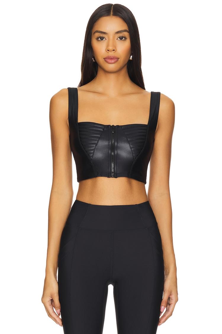 Shiny black faux leather defines this cropped corset with a fitted silhouette and square neckline, enhanced by wide straps for secure wear. The front zipper closure and padded bustier detailing add edgy sophistication, while subtle ruching at the front elevates the modern look. Crafted from a midweight polyamide-elastane blend, it ensures comfortable stretch and a sleek finish. Ideal for casual outings, date nights, or a chic night out, this statement piece balances bold style with versatile wearability across seasons.