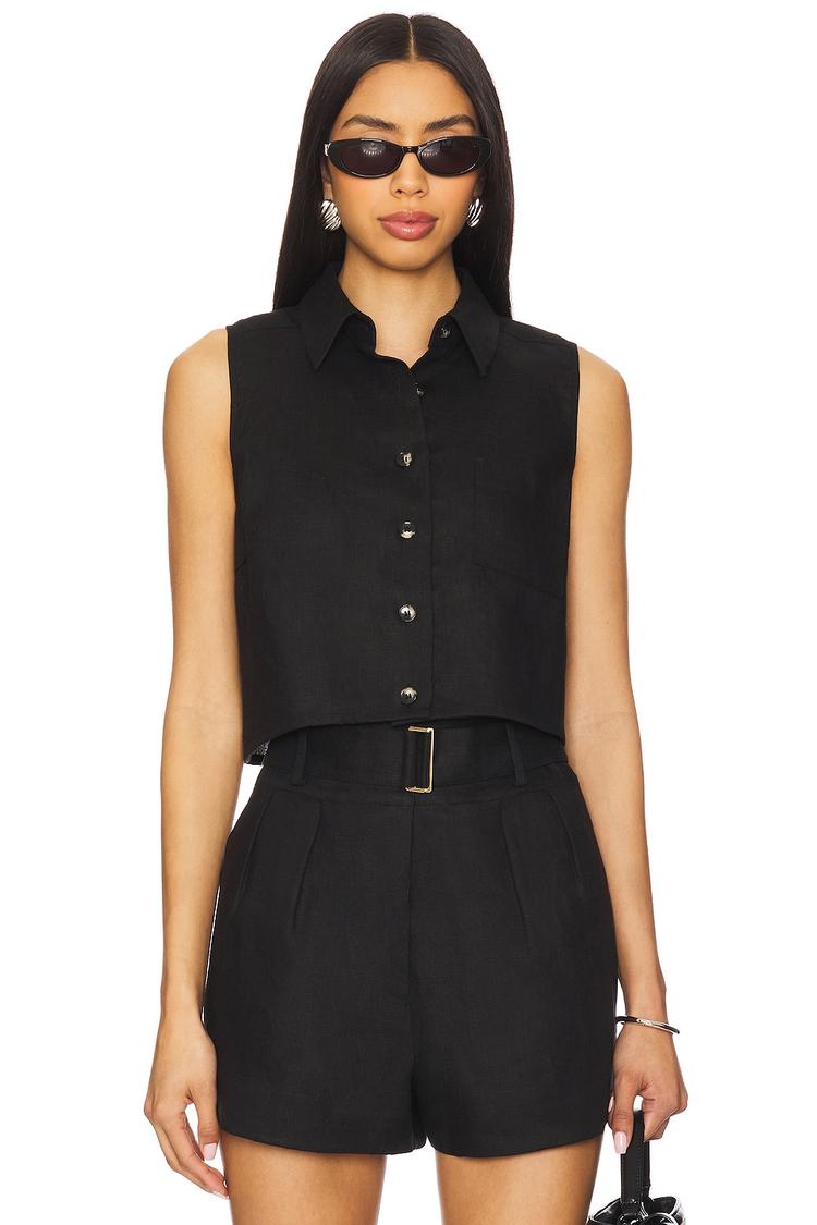 Crisp linen fabric and a cropped, sleeveless silhouette define this Katja Top with a classic collared neckline and front button closure. The relaxed fit combined with a single front patch pocket and belted waist adds subtle design interest and functionality. Ideal for spring through autumn, it pairs effortlessly with high-waisted bottoms for casual brunches, everyday errands, and business casual looks. Its minimalist black hue and clean lines provide versatility for multiple occasions, making it a refined yet comfortable choice for warm-weather dressing.