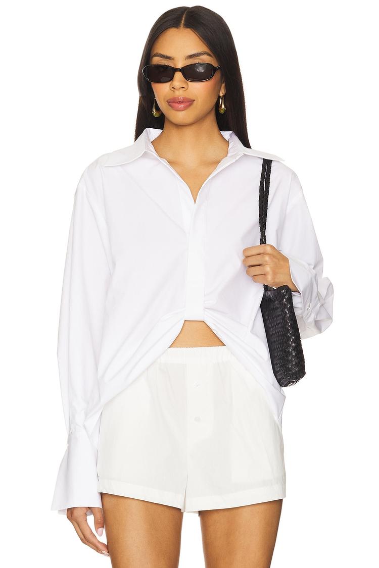 Crisp 100% cotton poplin fabric shapes this cropped, relaxed-fit Paola Top with a classic collar and long regular sleeves. The front tie-up detail adds a modern twist to the minimalist style, while buttoned cuffs and a back button closure enhance its refined look. Versatile for spring through autumn, this top pairs perfectly with shorts or tailored pants for casual outings, brunch dates, or workwear settings, offering effortless sophistication and breathable comfort.
