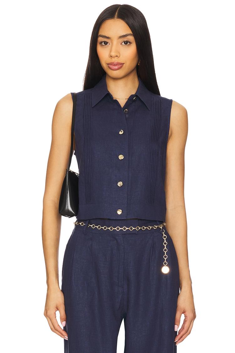 Midweight matte dark blue linen brings a timeless elegance to this sleeveless shell top, featuring a classic collared neckline and front button closure. Pleating details on the front add subtle texture, while the regular fit and waist length silhouette offer a polished yet comfortable look. Perfectly suited for casual days, workwear, business casual settings, brunches, or travel, this versatile top blends minimalist style with chic sophistication. Crafted from breathable linen, it ensures comfort throughout spring, summer, and autumn seasons.