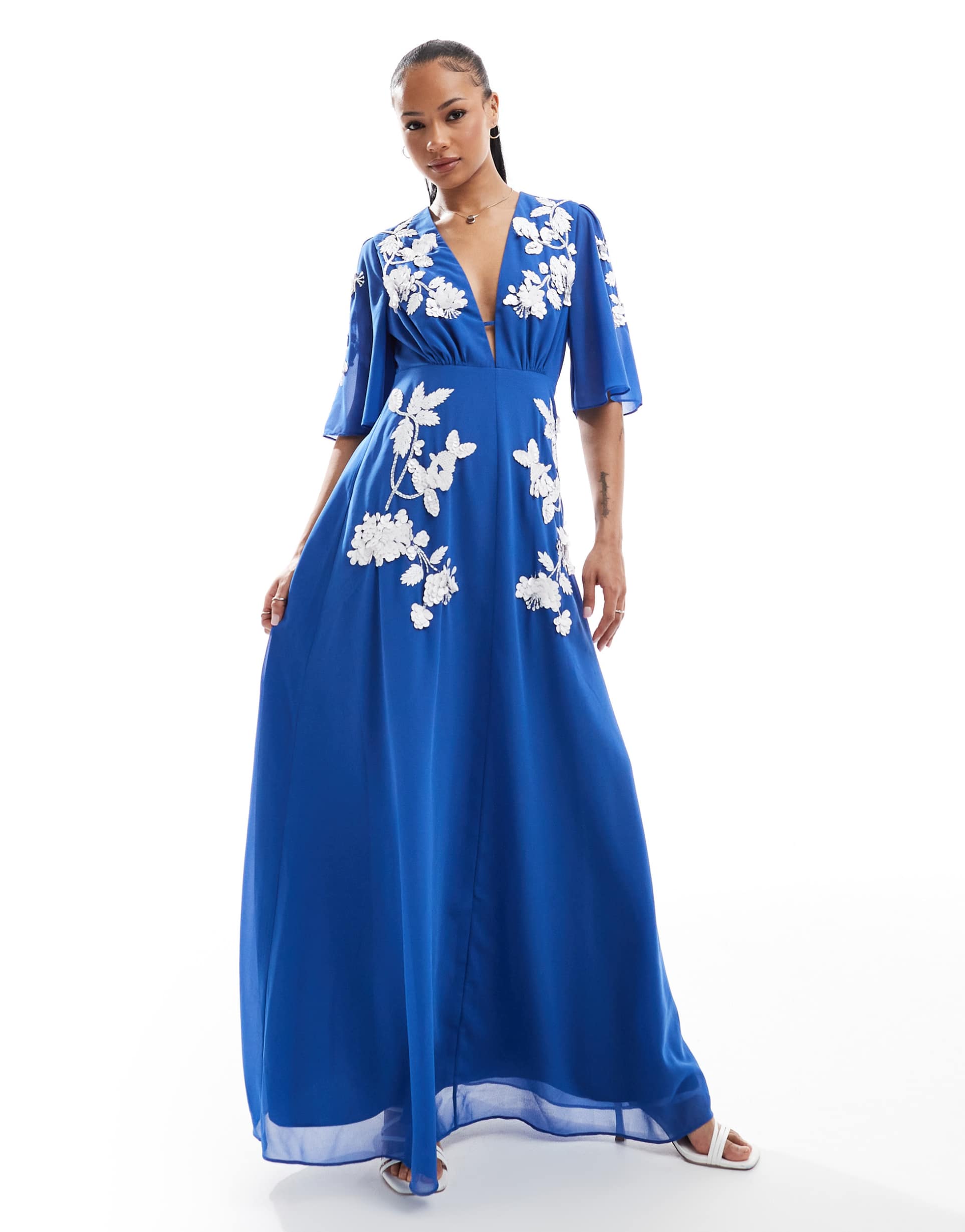 Soft chiffon overlays a flowing A-Line maxi silhouette in a striking matte blue hue, creating an elegant and romantic look. The dress features a plunging neckline paired with delicate angel sleeves and exquisite white floral appliqué embellishments on the front. Perfectly tailored for a regular fit and petite sizing, this gown offers a back zipper closure for ease. Ideal for spring and summer occasions such as brunches, date nights, or cocktail parties, it blends lightweight comfort with refined style.