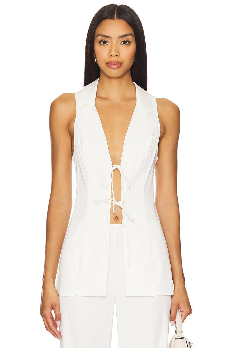 Lightweight satin viscose and a sleek notch lapel collar define this sleeveless blouson vest top, designed for a polished regular fit. Its tie-up front closure and hip-length silhouette offer a modern, minimalist aesthetic perfect for business casual, workwear, or a chic brunch look. The matte white color enhances its sophisticated vibe, making it versatile across spring, summer, and autumn seasons.